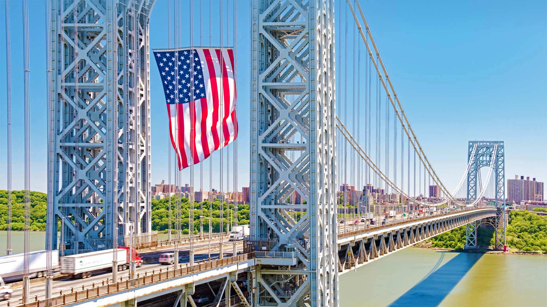 The George Washington Bridge displays the American flag in honor of Flag Day